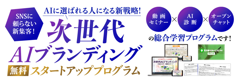 「AIに選ばれる人」になるためのブランディングのやりかたがマスターできる動画セミナー、受講した人が続々と成果を出しています!まずは無料のスタートアッププログラムで体感してみて下さい。